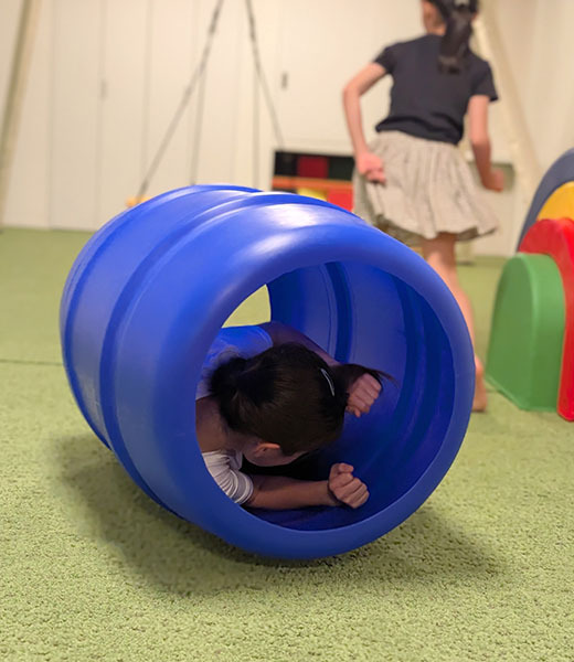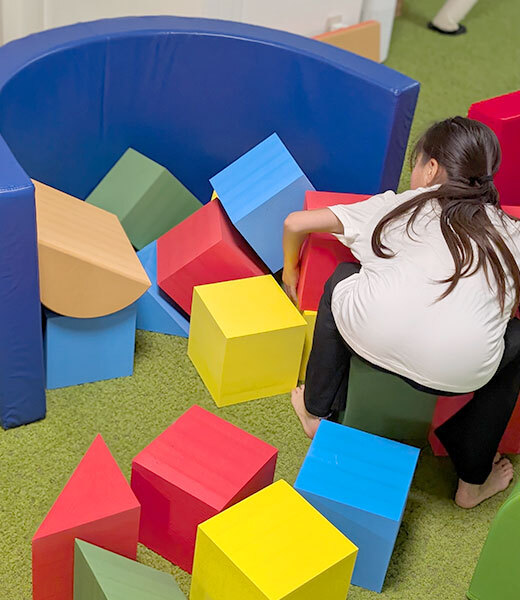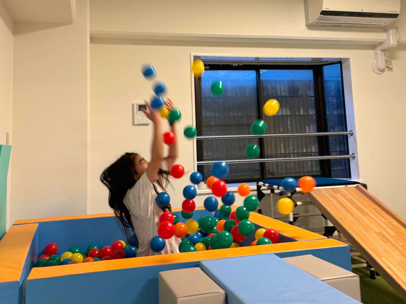 マンツーマンではなく、月齢に応じた遊びを提供します。暑い日や雨の日でも、室内でのびのびと遊べます。